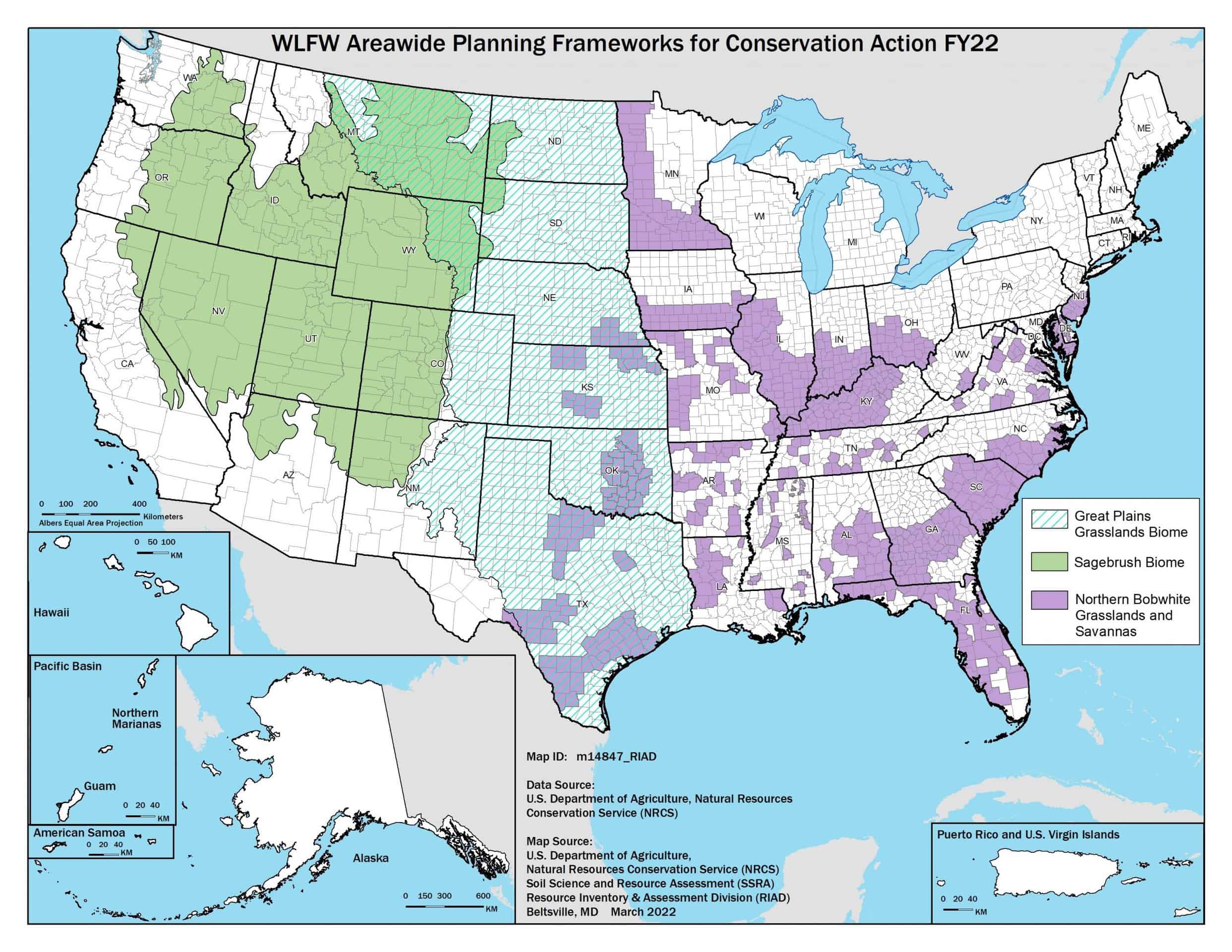 In 2021-2022, a multi-state, areawide planning team produced the first biome-scale frameworks for conservation action in the Great Plains grasslands, western sagebrush country, and for the central and eastern grasslands and savannas within 25 states in the northern bobwhite range. These frameworks for conservation action capture the science documenting the threats to biomes, or ecological landscapes, and the wildlife that are part of them, the conservation actions that NRCS can supports to address these threats and benefit producers, and the NRCS goals for implementing these actions over time.