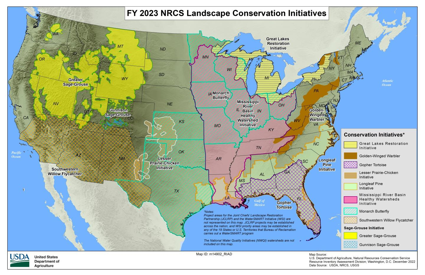 WLFW is currently active in 48 states. Eight national and 14 state-identified initiatives are used to focus individual projects that meet both the needs of the species as well as those of the agricultural operations. Individual species are used as barometers for healthy, functioning landscapes where conservation efforts also benefit a multitude of additional species as well.