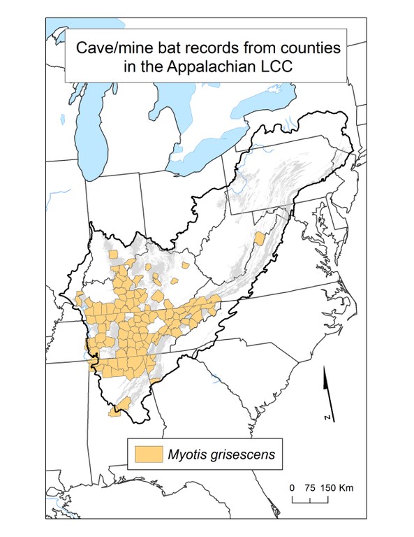 The utilization of caves by bats is quite different from other cave dwelling species. No bat spends its entire life in a cave, and during the summer, those species that roost leave at night to forage for food, primarily insects. Some species also hibernate in caves, and overall there is a varying degree of dependency on caves as a physical habitat. Many species are also found in mines, because some mines and caves are very similar habitats to bats. In the study area, there are ten species of bats that depend on caves and mines. This folder contains maps of the county scale distribution of bat species (a total of 10) which were considered.