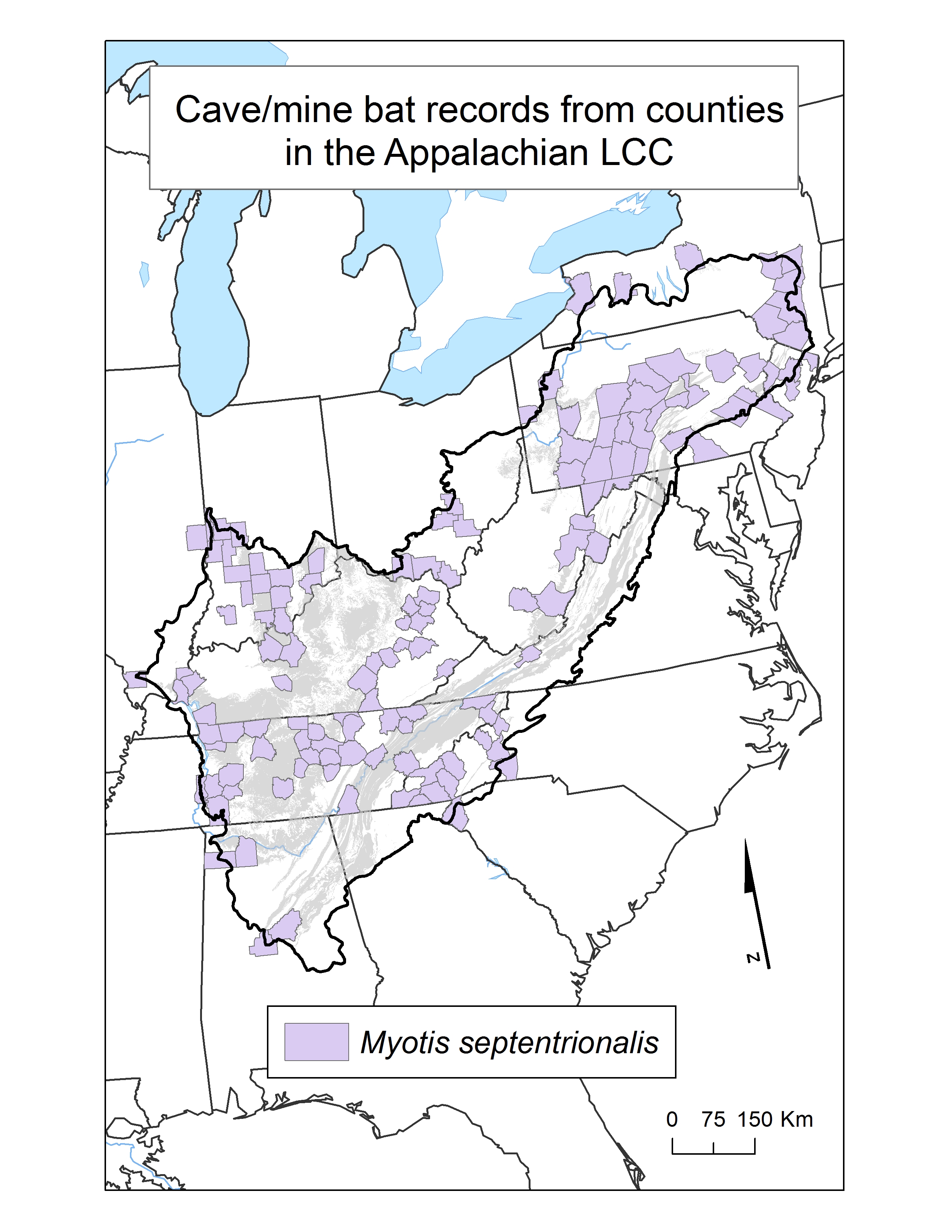 Distribution map of counties with a cave/mine occurrence for Northern long-eared bat (Myotis septentrionalis) within the Appalachian LCC region.