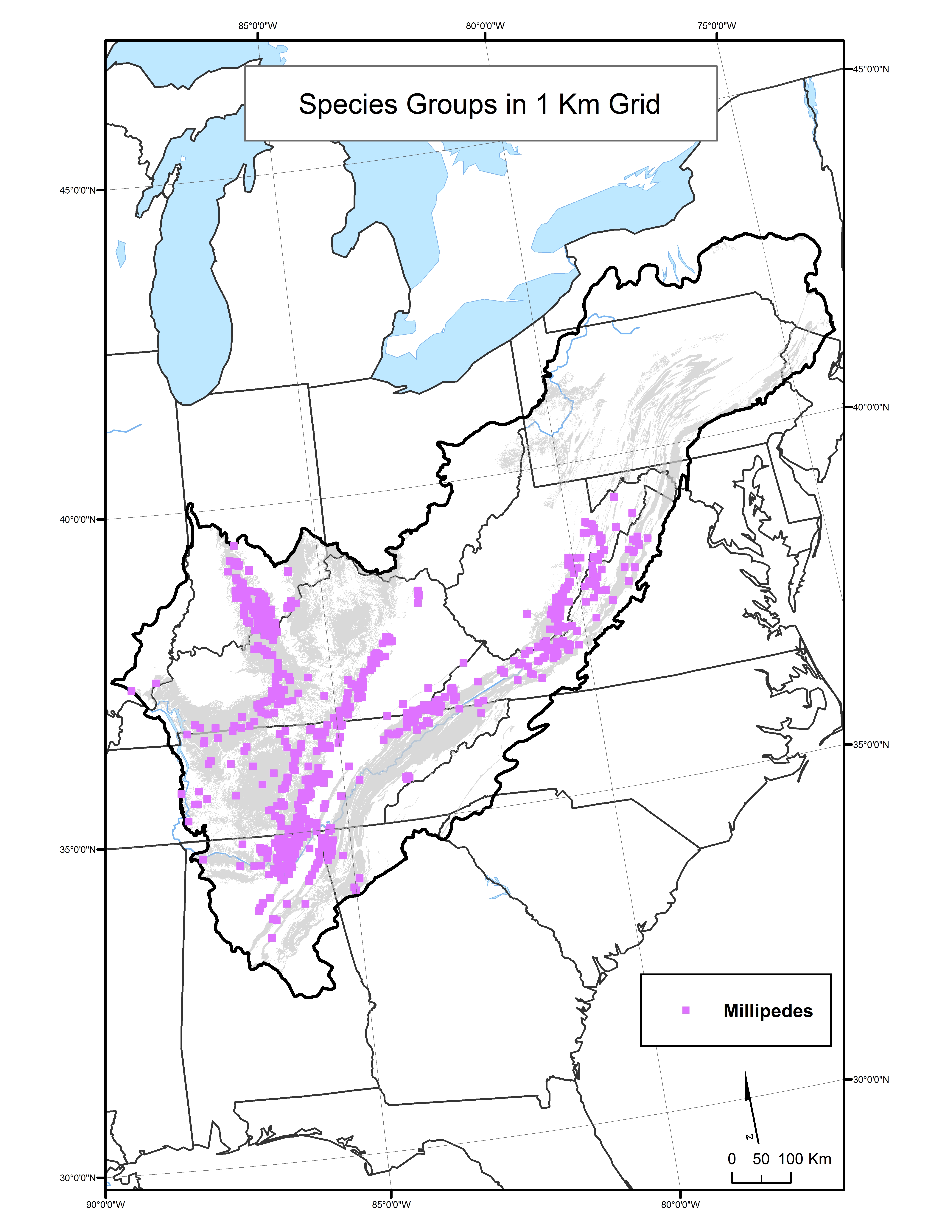 Distribution of millipede species by 1 kilometer grid throughout the Appalachian LCC region.