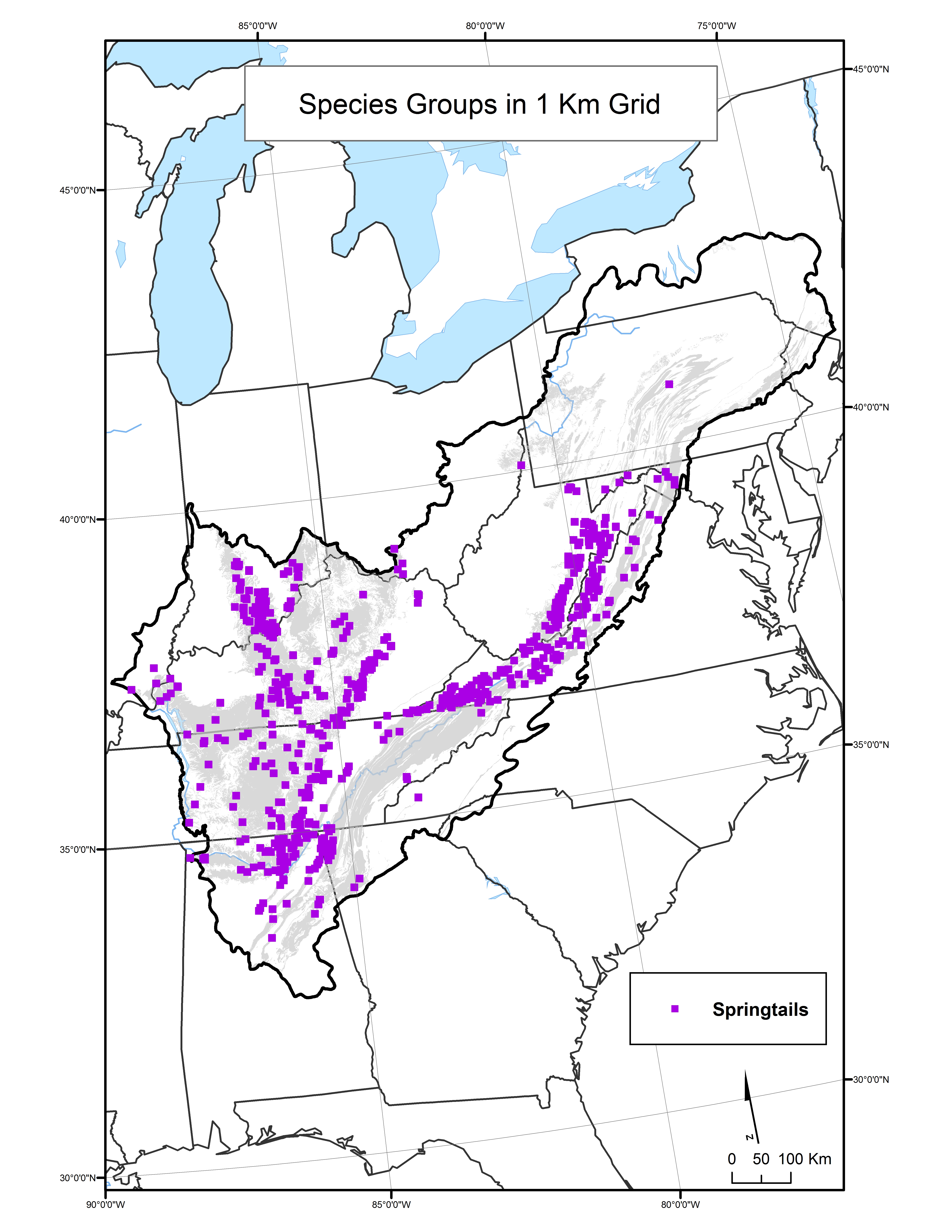 Distribution of springtail species by 1 kilometer grid throughout the Appalachian LCC region.
