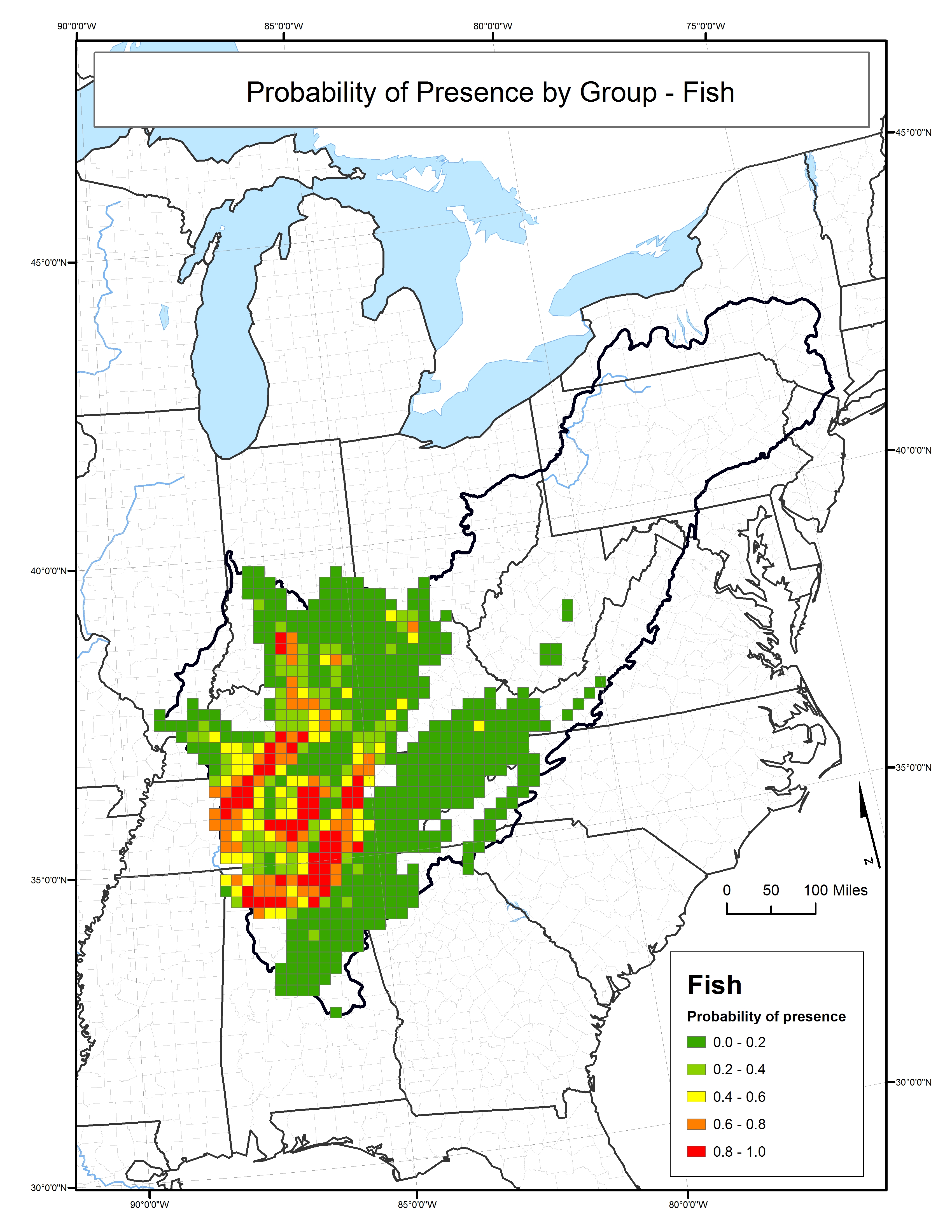This map depicts the probability of presence for species within the fish group throughout the Appalachian LCC region. Red areas have the highest probability of presence.