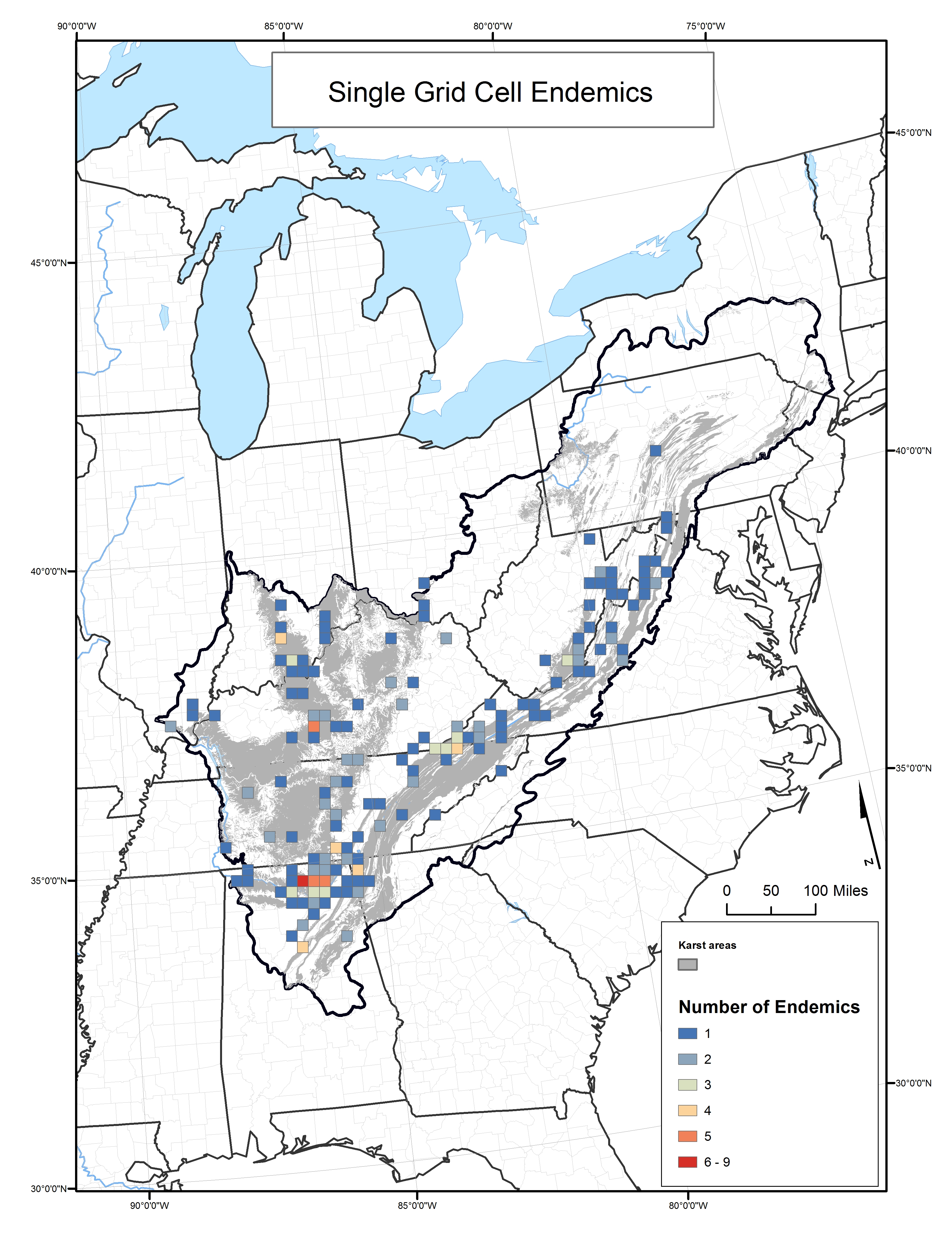 Many aquatic and terrestrial species are geographically rare, often found in a single cave. This map dis[;ays the geographic distribution of endemics scattered throughout the Appalachian LCC region.