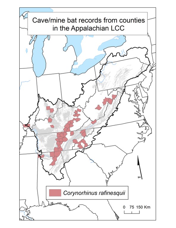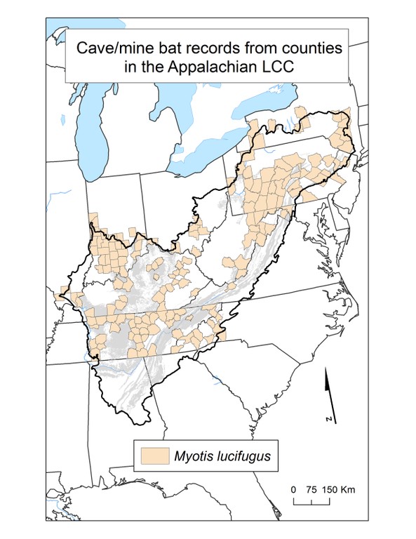 The utilization of caves by bats is quite different from other cave dwelling species. No bat spends its entire life in a cave, and during the summer, those species that roost leave at night to forage for food, primarily insects. Some species also hibernate in caves, and overall there is a varying degree of dependency on caves as a physical habitat. Many species are also found in mines, because some mines and caves are very similar habitats to bats. In the study area, there are ten species of bats that depend on caves and mines. This folder contains maps of the county scale distribution of bat species (a total of 10) which were considered.