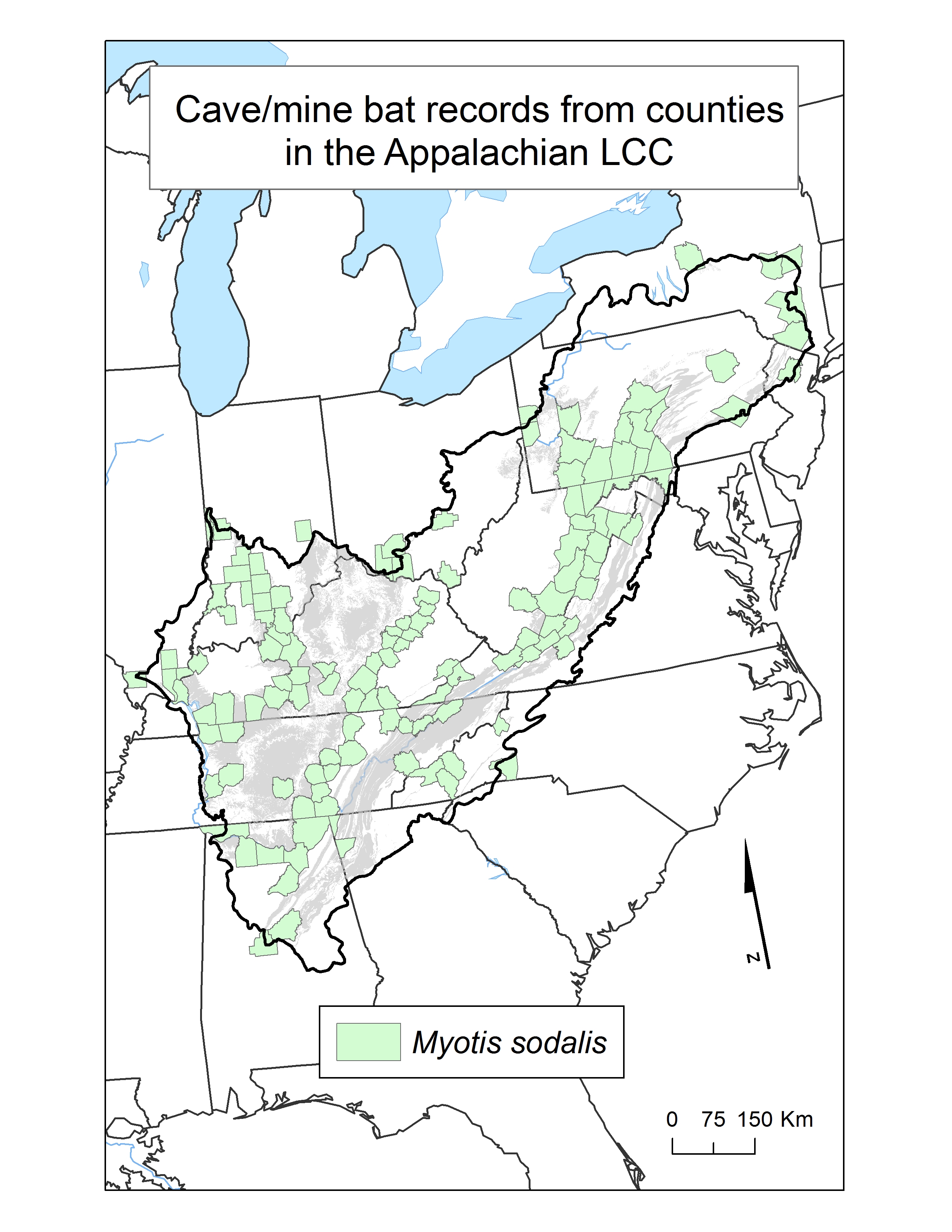 Distribution map of counties with a cave/mine occurrence for Indiana bat (Myotis sodalis) within the Appalachian LCC region.