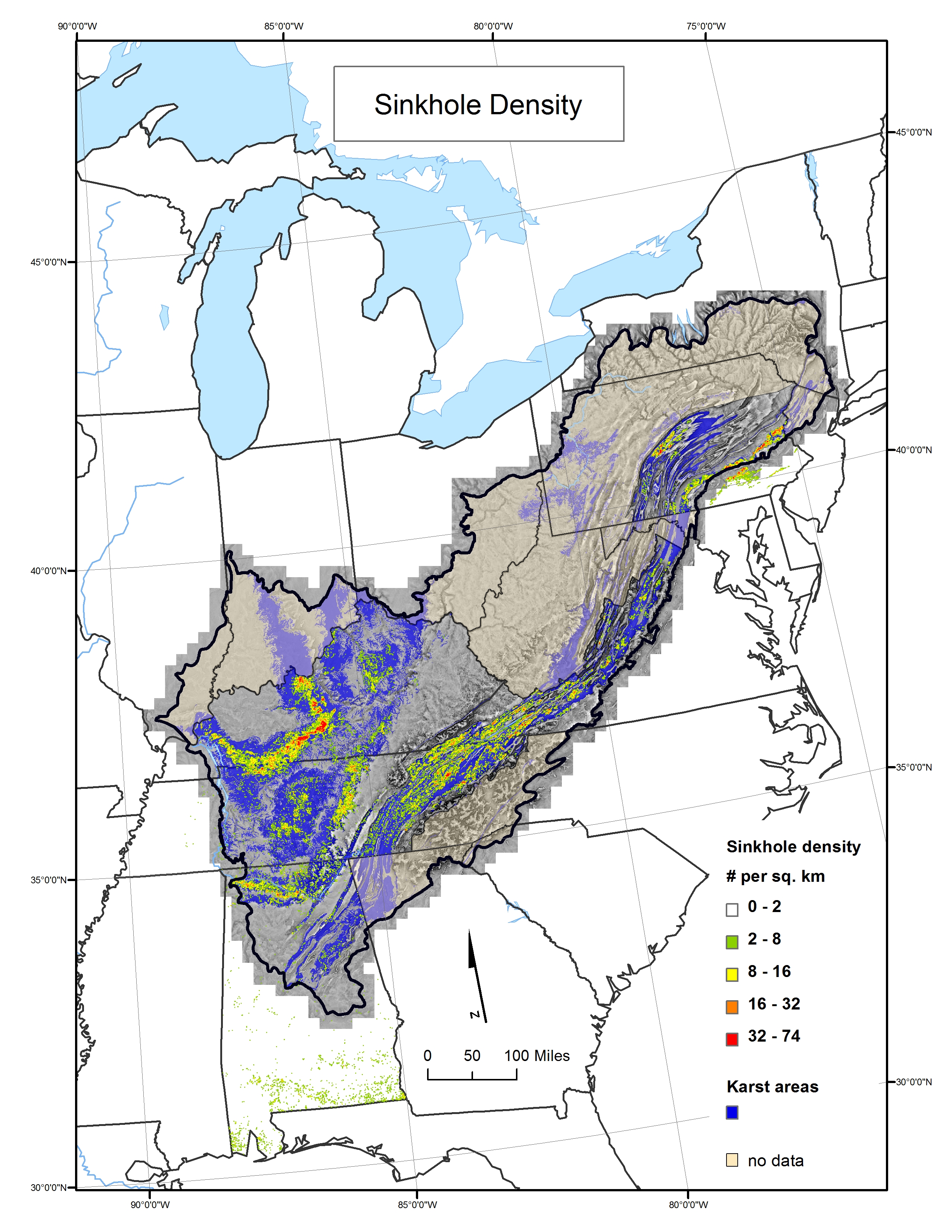 Density of sinkholes per square kilometer throughout the Appalachian LCC region.